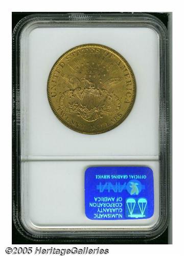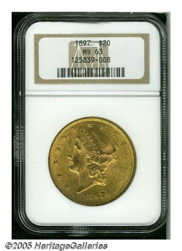 <B>1897<$20> MS63 NGC.</B></I> Deep golden-orange color and frosty luster define the overall appearance of this scarcer date example, along with a harshly scuffy cheek that limits the grade.