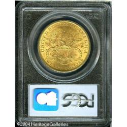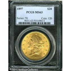 1897 $20 MS63 PCGS. An intricately struck and full <B>1897 $20 MS63 PCGS.</B></I> An intricately struck and fully lustrous piece that is impressively undisturbed despite a few minor luster grazes. <BR><BR><B>Important notice:</B> Heritage usually auctions material at the rate of 200-250 lots per hour. On some occasions eBay Live bid software or the Internet may not be able to keep up with the pace of the auction. We recommend placing a realistic absentee bid now as insurance to avoid disappointment. Occasionally the auctioneer may eliminate or reject an eBay Live bid, and the auctioneer may also reopen a lot after the close of the eBay live bidding (usually because we missed an audience bid), and may reject your bid even if it shows you as the winning bidder. By bidding via eBay Live, you agree that Heritage may award the lot to another bidder at its sole discretion under the circumstances described above or any other reasonable circumstances. Since eBay bids are not shown to us until we open the lot on the floor, we treat those bids just like floor bids. In most cases the floor responds before the eBay bid is presented to us, due to Internet lag time, so for consistency we have made it a policy that floor bids are always considered first over tie eBay live bids. Also please note that all Heritage lots purchased through eBay Live carry a 20% Buyer's Premium. Please make sure you read the Terms and Conditions before you bid. This lot is being auctioned in conjunction with a live floor auction by Heritage Galleries & Auctioneers. All final auction and invoice information will be supplied by Heritage Galleries & Auctioneers, and all other information should be considered preliminary. Lot:6977