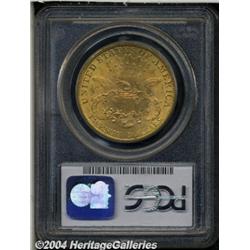 <B>1897<$20> MS63 PCGS.</B></I> Expectantly well produced for the type, this orange-gold survivor is also rather nicely preserved with just a few well scattered abrasions here and there. The certified population of this 1890s delivery falls off rapidly above the present grade level. <BR><BR><B>Important notice:</B> Heritage usually auctions material at the rate of 200-250 lots per hour. On some occasions eBay Live bid software or the Internet may not be able to keep up with the pace of the auction. We recommend placing a realistic absentee bid now as insurance to avoid disappointment. Occasionally the auctioneer may eliminate or reject an eBay Live bid, and the auctioneer may also reopen a lot after the close of the eBay live bidding (usually because we missed an audience bid), and may reject your bid even if it shows you as the winning bidder. By bidding via eBay Live, you agree that Heritage may award the lot to another bidder at its sole discretion under the circumstances described above or any other reasonable circumstances. Since eBay bids are not shown to us until we open the lot on the floor, we treat those bids just like floor bids. In most cases the floor responds before the eBay bid is presented to us, due to Internet lag time, so for consistency we have made it a policy that floor bids are always considered first over tie eBay live bids. Also please note that all Heritage lots purchased through eBay Live carry a 20% Buyer's Premium. Please make sure you read the Terms and Conditions before you bid.