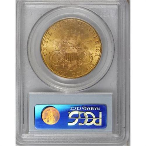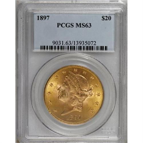 <B>1897 $20 MS63 PCGS.</B></I> A solidly struck Select representative of this later 19th century issue, faintly abraded with strong, satiny luster. The surfaces are primarily orange-gold, though the wheat-gold portrait shows a small copper spot in the hair to the right of the ear.<BR><BR><B>Coin Engraver:</B> James B. Longacre<BR><BR><b>Shipping:</b> Coins & Currency (<a target="_blank" href="http://www.heritageauctions.com/common/shipping.php">view shipping information</a>)