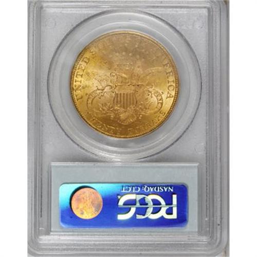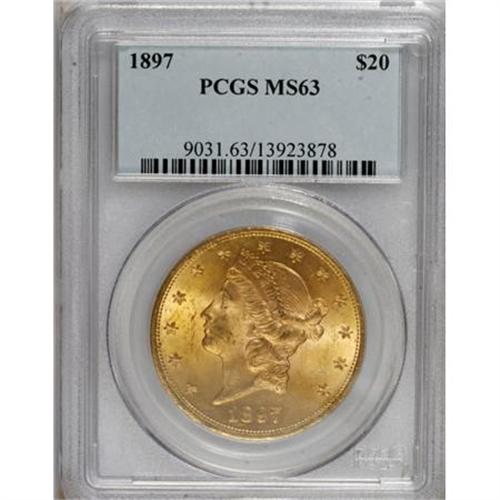 <B>1897 $20 MS63 PCGS.</B></I> The intense mint frost creates a dazzling cartwheel sheen across each side of this boldly detailed example. A typical number of superficial marks and luster grazes confirm the Select Mint State grade designation. <BR><BR><B>Coin Engraver:</B> James B. Longacre<BR><BR><b>Shipping:</b> Coins & Currency (<a target="_blank" href="http://www.heritageauctions.com/common/shipping.php">view shipping information</a>)