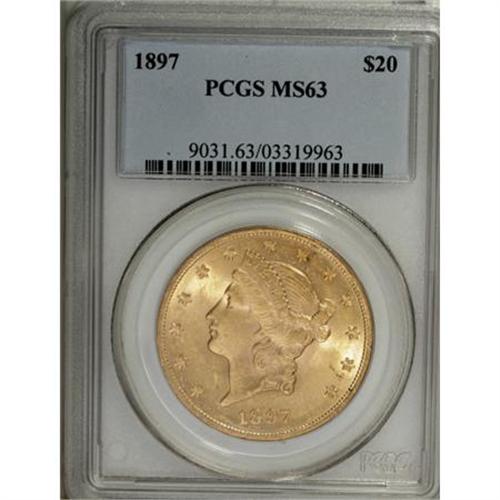 <B>1897 $20 MS63 PCGS.</B></I> PCGS Population (1166/163). NGC Census: (2169/290). Mintage: 1,383,261. Numismedia Wsl. Price for NGC/PCGS coin in MS63: $1,350. (#9031)<BR><BR><B>Coin Engraver:</B> James B. Longacre<BR><BR><b>Shipping:</b> Coins & Currency (<a target="_blank" href="http://www.heritageauctions.com/common/shipping.php">view shipping information</a>)