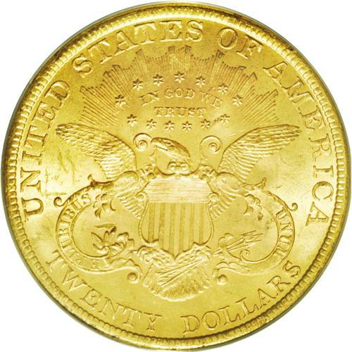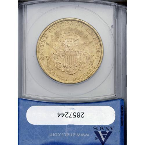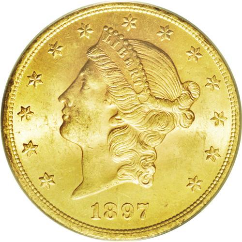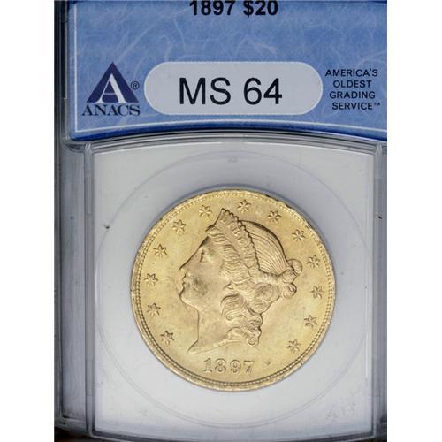 <B>1897<$20> MS64 ANACS.</B></I> Both sides are richly colored in green-gold hues with a dusting of pink-gold patina at the central regions. The satiny surfaces are free of all but a few trivial abrasions. While common in lower grades, the 1897 is scarce in grades that approach the MS65 level.