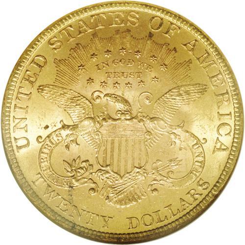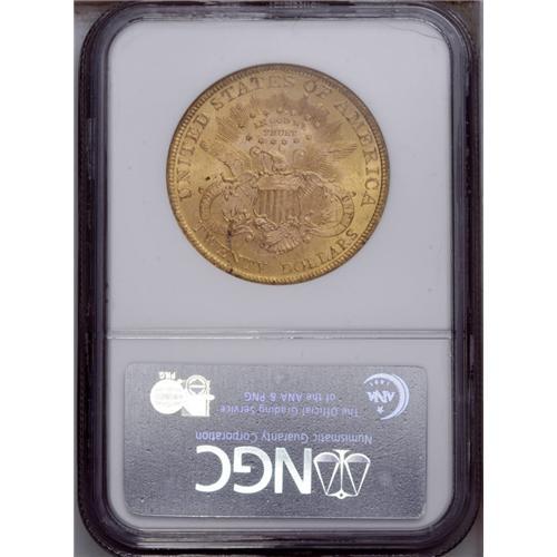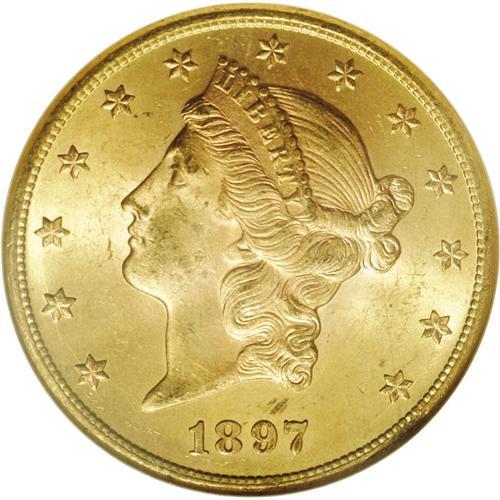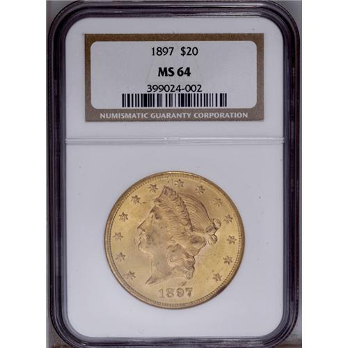 <B>1897 $20 MS64 NGC.</B></I> Satiny with irregular blushes of reddish and green-gold patina on each side and only a few light facial marks. Although a relatively obtainable issue in lesser Mint State grades, the availability of Choice examples thins out rapidly.