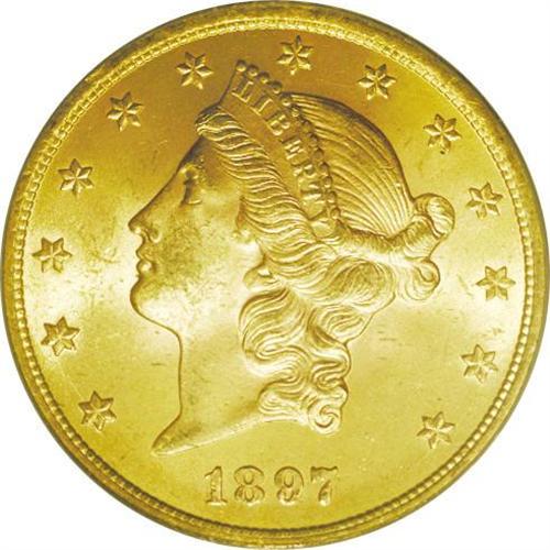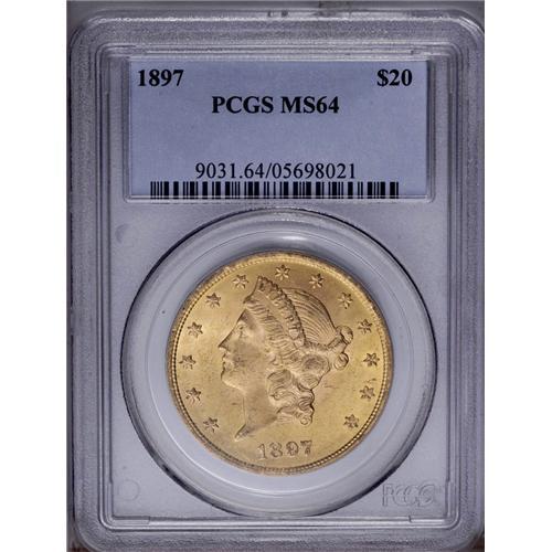 <B>1897<$20> MS64 PCGS.</B></I> The 1897 is one of the most common pre-1900 twenties from the mother Mint in Philadelphia. It is a common coin in the lower grades of Uncirculated but very few MS64 examples are known, especially when compared to this issue's availability in MS60-63 condition. Gems, by the way, are virtually unknown. This is a lovely, highly lustrous example that is sharply defined throughout. Population: 135 in 64, 1 finer (4/06).