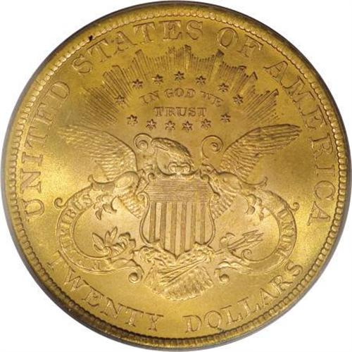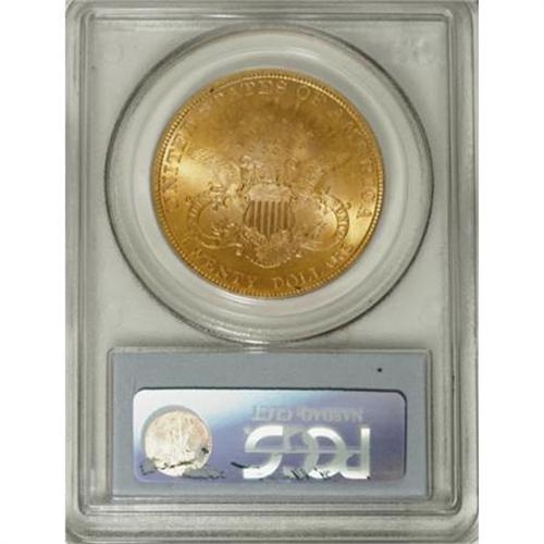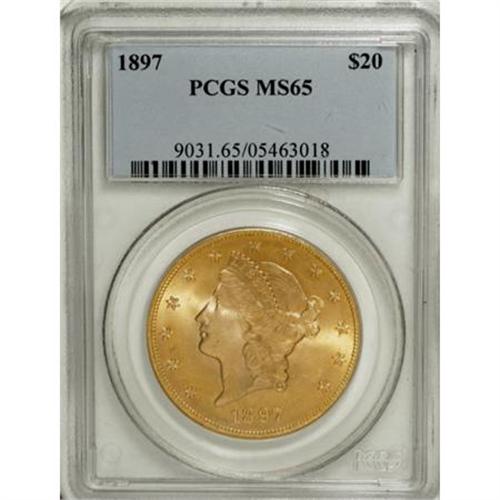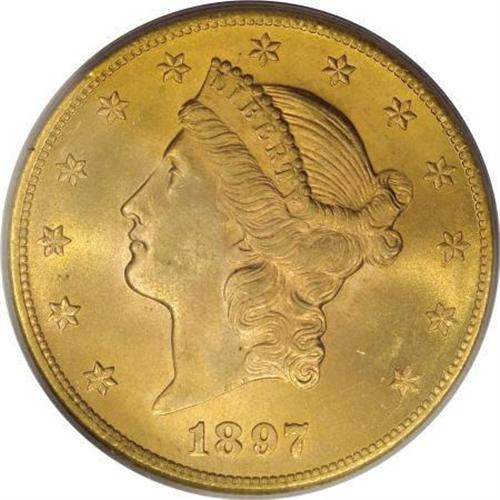 <B>1897 $20 MS65 PCGS.</B></I> Even though the Philadelphia Mint produced almost 1.4 million examples of this issue, the present specimen is the only Gem to be certified as such by PCGS. Fully struck, with intense cartwheel luster across each side, this piece displays absolutely exquisite rose-gold toning. The surfaces are well preserved and only show a few minuscule marks. It is hard to predict what such a coin will bring in the current market arena, with the emphasis placed upon Registry Set collections. A truly beautiful double eagle, and certainly one of the finest P-mint survivors from 1897. Population: 1 in 65, 0 finer (7/07). <BR><BR><B>Coin Engraver:</B> James B. Longacre<BR><BR><b>Shipping:</b> Coins & Currency (<a target="_blank" href="http://www.heritageauctions.com/common/shipping.php">view shipping information</a>\)