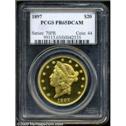 <table><tr><td><TABLE cellSpacing=0 cellPadding=0 width="100%" bgColor=#000000 border=0><TBODY> <TR><TD width="100%"><TABLE cellSpacing=1 cellPadding=3 width="100%" border=0><TBODY><TR><TD width="100%" bgColor=#79735c><FONT face=arial color=#ffffff size=3><B>Description</B> </FONT></TD></TR><TR><TD width="100%" bgColor=#ffffff><FONT face=arial size=2><B>1897 $20 PR65 Deep Cameo PCGS.</B></I> Of the 86 proofs that were produced, it is estimated that today only 20 or so pieces are still extant today as recognizable proof strikings. As a result, the 1897 is definitely one of the rarest proofs among late-date twenty Libs. This is a spectacular, high-contrast, two-toned proof striking that has illimitable depth of mirrored reflectivity in the fields and thick mint frost on the devices. A lovely, defect-free, cameo proof Gem. Population: 3 in 65, 0 finer (10/03). </FONT></TD></TR></TBODY></TABLE></TD></TR></TBODY></TABLE><BR><A name=PricesRealized></A><TABLE cellSpacing=0 cellPadding=0 width="100%" bgColor=#000000 border=0><TBODY><TR><TD width="100%"><TABLE cellSpacing=1 cellPadding=3 width="100%" border=0><TBODY><TR><TD width="100%" bgColor=#79735c><A name=PR><FONT face=arial color=#ffffff size=3><B>Previous Prices from Heritage Auctions</B> </FONT></A></TD></TR><TR><TD bgColor=#f6f6ed>No Prior Data Recorded </TD></TR><TR><TD bgColor=#ffffff><FONT face=arial size=1 ?>PLEASE NOTE: All prices realized reflect the final hammer price PLUS the buyer's premium in auctions that charge a buyer's premium. Each item has a notation at the top of the listing indicating whether that lot included a buyer's premium. Example: A item that sells with a final hammer price of $100 and a 20% buyer's premium will display with a price realized of $120. All information listed is intended to be as accurate as possible, but errors are possible. Please use this guide carefully and inform us of any inaccuracies. </FONT></TD></TR></TBODY></TABLE></TD></TR></TBODY></TABLE><BR><TABLE cellSpacing=0 cellPadding=0 width="100%" bgColor=#000000 border=0><TBODY><TR><TD width="100%"><TABLE cellSpacing=1 cellPadding=3 width="100%" border=0><TBODY><TR><TD width="100%" bgColor=#79735c colSpan=6><FONT face=arial color=#ffffff size=3><B>Price Guide*</B> </FONT></TD></TR><TR bgColor=#f6f6ed><TD align=middle><B>Grade</B> </TD><TD align=middle><B>Coin World<BR>(Trends)</B> </TD><TD align=middle><B>Numismedia<BR>Retail</B> </TD><TD align=middle><B>Numismedia<BR>Wholesale</B> </TD><TD align=middle><B>Coin<BR>Universe</B> </TD><TD align=middle><B>Heritage<BR>Value Index</B> </TD></TR><TR bgColor=#ffffff><TD align=middle>64</TD><TD align=right>---</TD><TD align=right>---</TD><TD align=right>---</TD><TD align=right>$36,500.00</TD><TD align=right>$23,575.00</TD></TR><TR style="FONT-WEIGHT: bold" bgColor=#cccfdd><TD align=middle>65</TD><TD align=right>---</TD><TD align=right>---</TD><TD align=right>---</TD><TD align=right>---</TD><TD align=right>$42,750.00</TD></TR><TR bgColor=#ffffff><TD align=middle>66</TD><TD align=right>---</TD><TD align=right>---</TD><TD align=right>---</TD><TD align=right>---</TD><TD align=right>---</TD></TR><TR bgColor=#ffffff><TD colSpan=6><FONT size=1>*All information listed is intended to be as accurate as possible, but errors are possible. No item may be returned or refused based on this information which is provided as a service to our customers. You should contact each pricing source directly to determine the accuracy of this information. </FONT></TD></TR></TBODY></TABLE></TD></TR></TBODY></TABLE><BR><TABLE cellSpacing=0 cellPadding=0 width="100%" bgColor=#000000 border=0><TBODY><TR><TD width="100%"><TABLE cellSpacing=1 cellPadding=3 width="100%" border=0><TBODY><TR><TD width="100%" bgColor=#79735c><FONT face=arial color=#ffffff size=3><B>Population Guide</B> </FONT></TD></TR><TR bgColor=#ffffff><TD align=middle><!-- Begin Output of Population Grid--><TABLE cellSpacing=0 cellPadding=0 width="100%" border=0><TBODY><TR><TD vAlign=center><TABLE cellSpacing=0 width="100%" border=1 cellsadding="3"><TBODY><TR><TD vAlign=center><TABLE cellSpacing=0 cellPadding=3 width="100%" border=1><TBODY><TR><TD vAlign=center align=middle bgColor=#f0f1e8 colSpan=2 <CENTER><FONT face=Arial size=2><B>PCGS Pop </B></FONT><CENTER></CENTER></TD><TD vAlign=center align=middle bgColor=#f0f1e8 colSpan=2><CENTER><FONT face=Arial size=2><B>NGC Pop</B></CENTER></FONT></TD></TR><TR><TD vAlign=center><FONT face=Arial size=2>(65)</FONT> </TD><TD vAlign=center align=right><FONT face=Arial size=2>3</FONT> </TD><TD vAlign=center><FONT face=Arial size=2>(65)</FONT> </TD><TD vAlign=center align=right><FONT face=Arial size=2>1</FONT> </TD></TR><TR><TD vAlign=center><FONT face=Arial size=2>(>65)</FONT> </TD><TD vAlign=center align=right><FONT face=Arial size=2>0</FONT> </TD><TD vAlign=center><FONT face=Arial size=2>(>65)</FONT> </TD><TD vAlign=center align=right><FONT face=Arial size=2>0</FONT> </TD></TR></TBODY></TABLE></TD></TR></TBODY></TABLE></TD></TR></TBODY></TABLE><!-- End Output of Population Grid--></TD></TR></TBODY></TABLE></TD></TR></TBODY></TABLE><BR><TABLE cellSpacing=0 cellPadding=0 width="100%" bgColor=#000000 border=0><TBODY><TR> Important notice: Heritage usually auctions material at the rate of 200-250 lots per hour. On some occasions eBay Live bid software or the Internet may not be able to keep up with the pace of the auction. We recommend placing a realistic absentee bid now as insurance to avoid disappointment. Occasionally the auctioneer may eliminate or reject an eBay Live bid, and the auctioneer may also reopen a lot after the close of the eBay live bidding (usually because we missed an audience bid), and may reject your bid even if it shows you as the winning bidder. By bidding via eBay Live, you agree that Heritage may award the lot to another bidder at its sole discretion under the circumstances described above or any other reasonable circumstances. Also please note that all Heritage lots purchased through eBay Live carry a 20% 