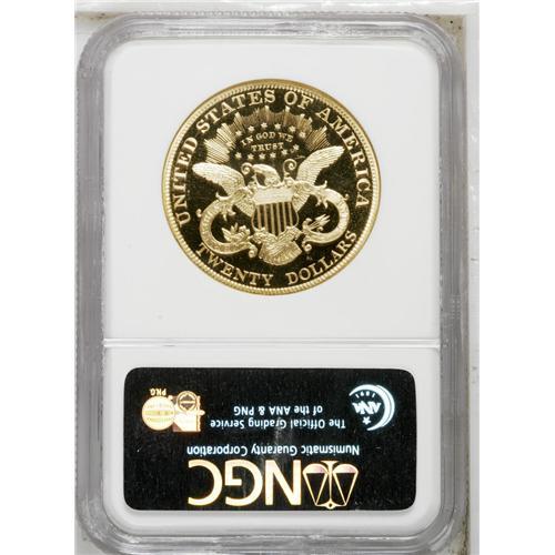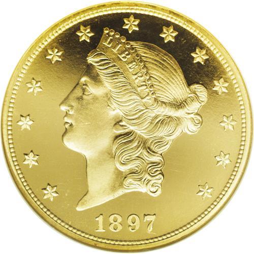 <B>1897<$20> PR65 Ultra Cameo NGC.</B></I> In the late 19th century, mintages of proof gold coins were extremely limited, due mostly to the relative size of the necessary investment to collect such coins. In the 1890s, for example, there were not many collectors who could afford $40 per year for a set of such coins. In 1897, just 86 proof double eagles were minted, and only about 25 of those coins still survive today, although the actual number of estimated survivors varies from one author to another. Garrett and Guth estimated 20 to 25 examples in their <I>Encyclopedia of U.S. Gold Coins.</B></I> In his <I>Complete Encyclopedia,</B></I> Walter Breen suggested that 18 to 24 examples survive, and David Akers placed the number at 18 to 22 pieces in the Pittman catalog. In his double eagle <I>Red Book,</B></I> Dave Bowers suggested a much higher figure of 30 to 40 surviving proofs.<BR> One of the greatest challenges in numismatics is the accurate estimation of survivors for any given coin, and this is especially difficult for proof gold coinage. The only accurate method to make such a determination is to create an actual Census of known specimens. This involves careful comparison of auction offerings to match photos from one auction appearance to another. While this is quite easy to do in certain series (early large cents, for example), it is extremely difficult in other series. In the case of proof gold coins, where photographs often give the impression that a coin is perfect, the process of plate matching is nearly impossible. Once this plate matching is accomplished, it is still necessary to figure out what coins are held by museums and private collections that may never have appeared in an auction.<BR> The best aid to the researcher is the tiny lint marks and blemishes that appear on the coins. For example, the present example has a small chatter mark on Liberty's cheek, midway between the