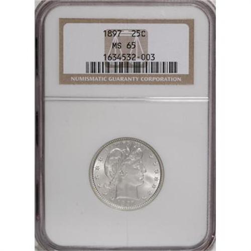 <B>1897 25C MS65 NGC.</B></I> An exacting strike virtually completes the design elements on this wonderful Gem. White surfaces exhibit full luster, and are devoid of significant marks. Census: 19 in 65, 7 finer (1/08).<BR><I>From The Southwest Collection.</B></I><BR><BR><B>Coin Engraver:</B> Charles E. Barber<BR><BR><b>Shipping:</b> Coins & Currency (<a target="_blank" href="http://www.heritageauctions.com/common/shipping.php">view shipping information</a>)