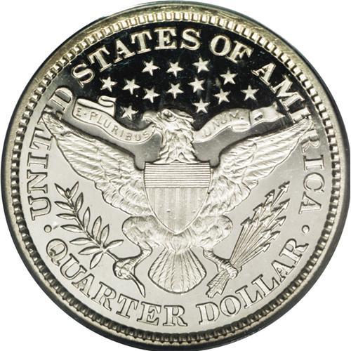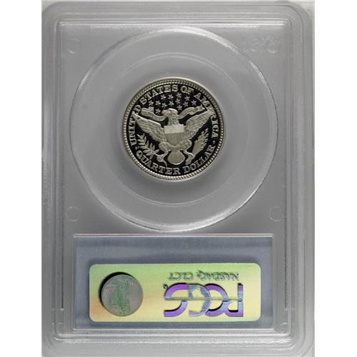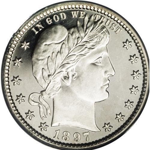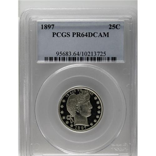 <B>1897<25C> PR64 Deep Cameo PCGS.</B></I> Thick white frost dominates the devices, and is broken only near Liberty's ear, which is a target for die polishing on proofs of this design. This untoned near-Gem has a few faint obverse field hairlines, but these do not affect the obvious eye appeal. A mere 731 pieces were produced. Population: 2 in 64 Deep Cameo, 9 finer (6/06).