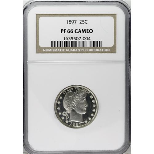 <B>1897 25C PR66 Cameo NGC.</B></I> A largely untoned Premium Gem with pinpoint sharpness and excellent contrast between the gleaming fields and heavily frosted devices. A small area of cloudiness is noted above the shield on the reverse. An example of this quality rarely fails to impress. Census: 16 in 66 Cameo, 11 finer (12/06).<BR><BR><b>Shipping:</b> Coin/Currency (<a target="_blank" href="http://www.heritageauctions.com/common/shipping.php">view shipping information</a>)