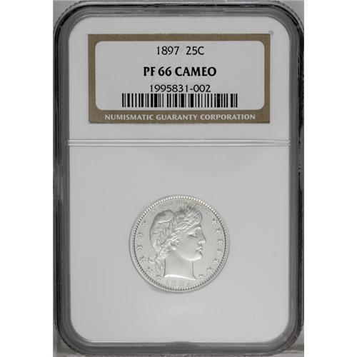 <B>1897<25C> PR66 Cameo NGC.</B></I> A lovely Superb Gem with a brilliant obverse and reverse, each side showing an absence of toning. Every detail of the fletchings and the shield corners is seemingly fully delivered. The cameo contrast is unmistakable, and the fields have good reflectivity. A well preserved representative of this low mintage proof issue. Census: 12 in 66, 9 finer (3/06).