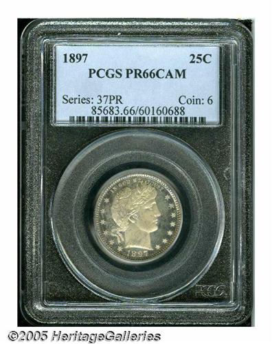 <B>1897<25C> PR66 Cameo PCGS.</B></I> A touch of hazy golden-gray patina on the obverse fails to diminish the coin's impressive field-to-device contrast. Rich amber and blue iridescent shades dominate the reverse. Population: 5 in 66 Cameo, 5 finer (5/05).<BR><I>From The Western Hills Collection.</B></I>