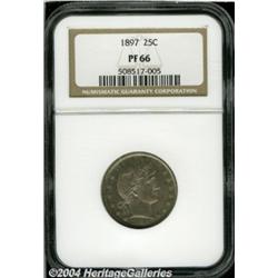 <B>1897<25C> PR66 NGC.</B></I> Just 731 proof Barber quarters were struck in 1897 during an era of modest proof production. In fact, this issue has the lowest proof mintage during the first dozen years of the Barber design. This is a splendid and superb Gem proof with heather and iridescent color over deeply mirrored fields. The devices have frosty luster with the cameo contrast subdued by the toning. While we have handled several similar quality examples of this issue in recent months, it has been almost three years since we last handled a finer grade specimen. Population: 31 in 66, 20 finer (7/04). <BR><BR><B>Important notice:</B> Heritage usually auctions material at the rate of 200-250 lots per hour. On some occasions eBay Live bid software or the Internet may not be able to keep up with the pace of the auction. We recommend placing a realistic absentee bid now as insurance to avoid disappointment. Occasionally the auctioneer may eliminate or reject an eBay Live bid, and the auctioneer may also reopen a lot after the close of the eBay live bidding (usually because we missed an audience bid), and may reject your bid even if it shows you as the winning bidder. By bidding via eBay Live, you agree that Heritage may award the lot to another bidder at its sole discretion under the circumstances described above or any other reasonable circumstances. Since eBay bids are not shown to us until we open the lot on the floor, we treat those bids just like floor bids. In most cases the floor responds before the eBay bid is presented to us, due to Internet lag time, so for consistency we have made it a policy that floor bids are always considered first over tie eBay live bids. Also please note that all Heritage lots purchased through eBay Live carry a 20% Buyer's Premium. Please make sure you read the Terms and Conditions before you bid. </span></font></tr></table></td></tr></table>