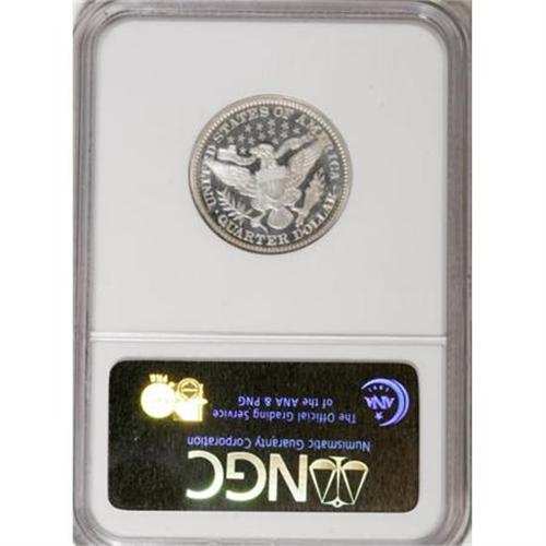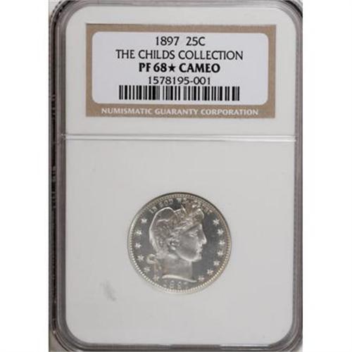 <B>1897 25C PR68 </B></I><img src="/images/star.gif" width="10" height="10" alt="" border="0"><B> Cameo NGC.</B></I> Ex: Childs Collection. A wonderfully preserved PR68 <img src="/images/star.gif" width="10" height="10" alt="" border="0"> with no toning on either side. The devices are snow-white and frosty while the mirrors are deep and appear black with their uniform reflectivity. As expected the strike is complete and there are some die polishing marks on both sides. The NGC Star Designation identifies coins with exceptional eye appeal and in describing the program on its website NGC states that, "Every star designated coin is something special to see." This example is no exception and offers a visual feast. It is doubtful that any of the 731 proofs struck this year can compete with this one in terms of eye appeal. Census: 2 in 68 <img src="/images/star.gif" width="10" height="10" alt="" border="0">, 0 finer (12/07).<BR><BR><b>Shipping:</b> Coins & Currency (<a target="_blank" href="http://www.heritageauctions.com/common/shipping.php">view shipping information</a>)
