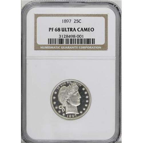<B>1897 25C PR68 Ultra Cameo NGC.</B></I> An amazing Superb Gem proof with deep or "ultra" cameo contrast, as labeled by NGC. Both sides are entirely brilliant and completely untoned. The devices are incredible with full and complete design definition, enhanced by highly lustrous and fully brilliant mint frost. In the late 1890s, contrast on proof coins was as strong as ever, but that soon changed. The next decade saw serious attempts to eliminate cameo contrast entirely, and it would be several decades before it returned. For the type collector who desires a Superb Gem proof with exceptional contrast, this 1897 is an ideal choice. Census: 2 in 68 Ultra Cameo, 0 finer (1/08).<BR><BR><b>Shipping:</b> Coins & Currency (<a target="_blank" href="http://www.heritageauctions.com/common/shipping.php">view shipping information</a>)