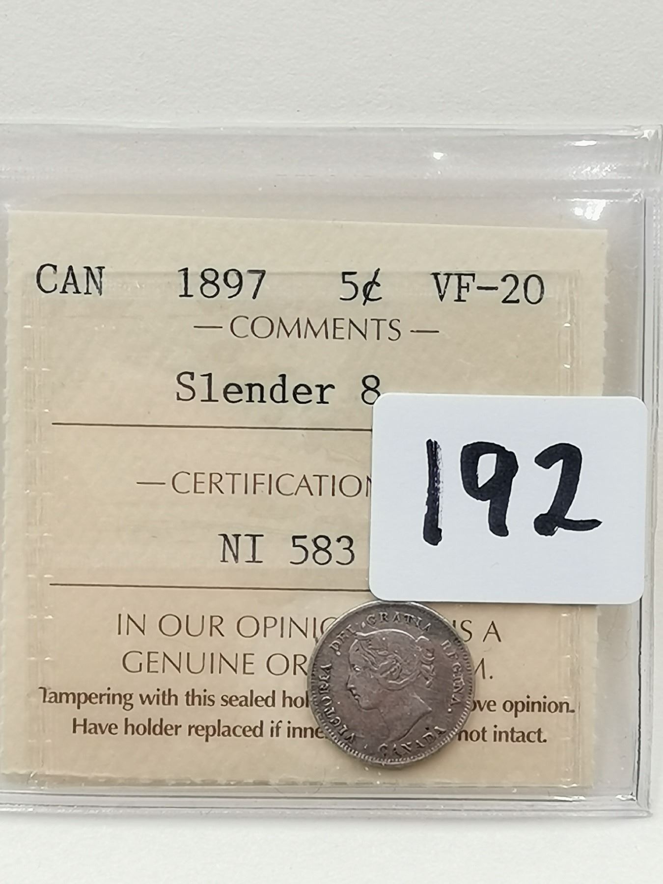 1897 5 Cent, SLENDER 8, VF20 CERTIFY