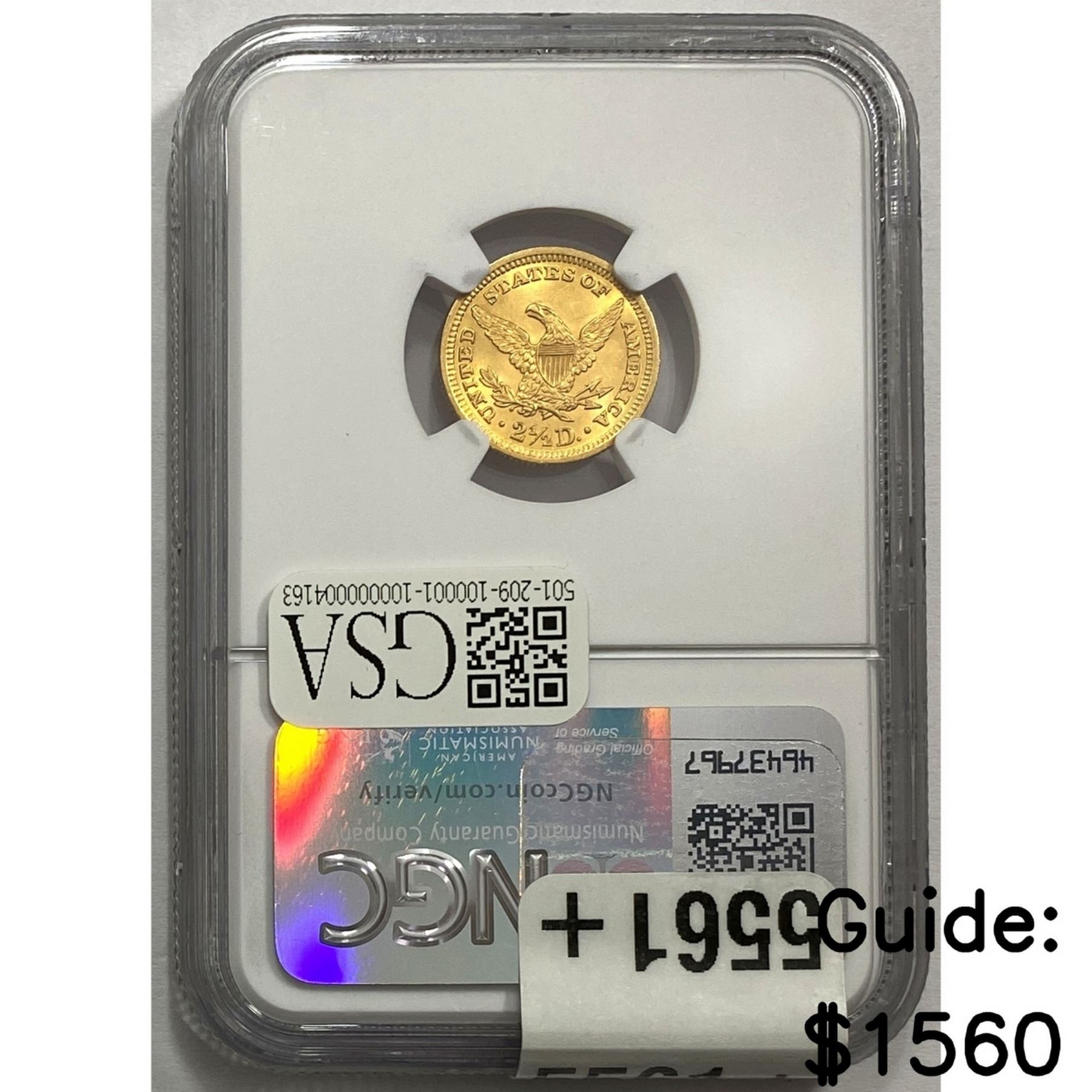 e. Coins sold referencing a third-party grading service are sold “AS IS” without any express or implied warranty, except for a guarantee by GSA that they are genuine. Removal or alteration of the holder, voids all of Bidder’s claims concerning that Product. Certain warranties may be available from the grading services and Bidders are referred to them for further details: Numismatic Guaranty Corporation (NGC), PO Box 4776, Sarasota, FL 34230, www.ngccoin.com/services/writtenguarantee.asp; Professional Coin Grading Services (PCGS), PO Box 9458, Newport Beach, CA 92658, www.pcgs.com/guarantee.html; ANACS, 6555 S. Kenton St., Ste. 303, Englewood, CO 80111; and Independent Coin Grading Co. (ICG), 7901 East Bellview, Ave., Suite 50, Englewood, CO 80111.