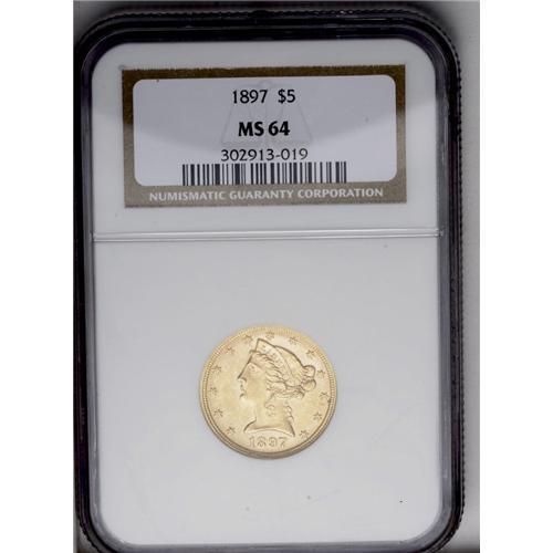 <B>1897<$5> MS64 NGC.</B></I> With an original mintage of less than 900,000 pieces, it is little wonder that this P-mint issue is a prized commodity at the MS64 level. There are no significant abrasions on either side and the surfaces boast needle-sharp definition and luster to spare.<BR><I>From The Steve Glenn Collection, Part Two.</B></I>