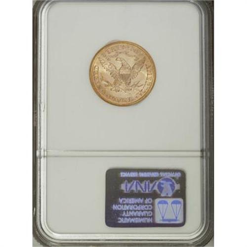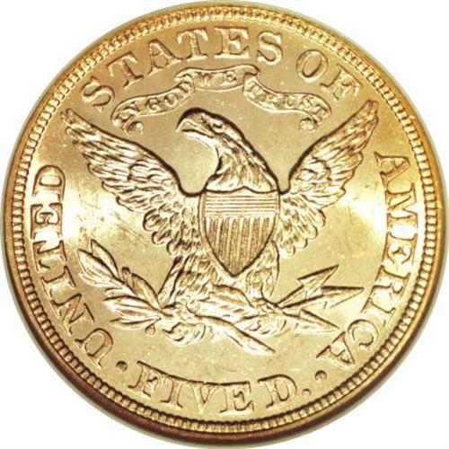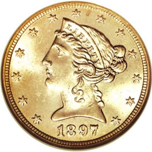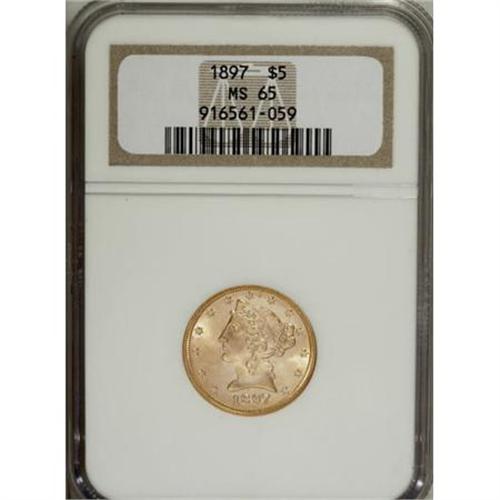 <B>1897 $5 MS65 NGC.</B></I> Dazzling luster and clean surfaces confirm the quality of this honey-gold Gem. The strike is sharp aside from the occasional star center. Even for its lofty grade, the present piece is highly attractive, and is worthy of a quality gold type set. Census: 66 in 65, 8 finer (2/08).<BR><BR><B>Coin Engraver:</B> Christian Gobrecht<BR><BR><b>Shipping:</b> Coins & Currency (<a target="_blank" href="http://www.heritageauctions.com/common/shipping.php">view shipping information</a>)