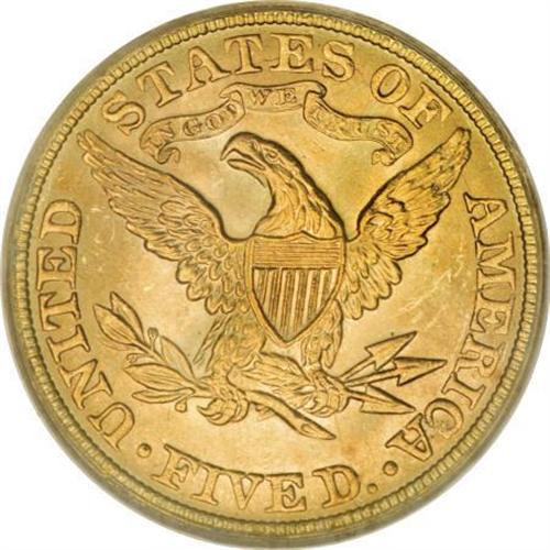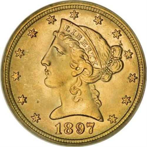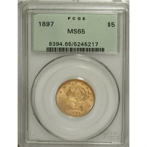 <B>1897 $5 MS65 PCGS. CAC.</B></I> This lustrous peach-gold Gem is well struck save for trivial incompleteness on star 3. The fields have only a few wispy marks, and the eye appeal is undeniable. Rare at the MS65 level, and unattainable any finer at PCGS. Certified in a green label holder. Population: 10 in 65, 0 finer (11/07).<BR><I>From The Madison Collection.</B></I><BR><BR><B>Coin Engraver:</B> Christian Gobrecht<BR><BR><b>Shipping:</b> Coins & Currency (<a target="_blank" href="http://www.heritageauctions.com/common/shipping.php">view shipping information</a>)