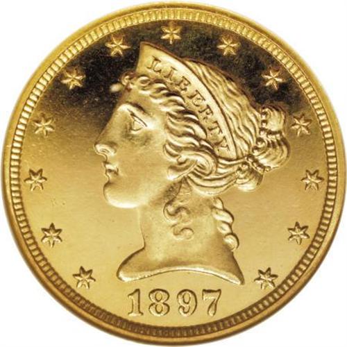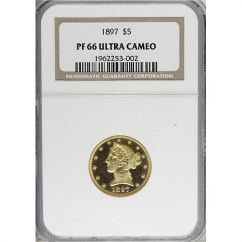 <B>1897 $5 PR66 Ultra Cameo NGC.</B></I> In his landmark 1979 book on half eagles, David Akers offered the following commentary about the special strikings of 1897: "Proofs are rare." The assessment is minimalist but factual; earlier estimates of up to 40 survivors have given way to lower numbers, with Garrett and Guth (2006) indirectly naming a range of 20 to 30 pieces for the issue. Assuming resubmissions, the combined census for NGC and PCGS, 41 pieces across all grades and states of contrast, is consistent with the upper end of the Garrett and Guth estimate. Later issues have larger surviving populations; the 1898 proof issue has a combined census record of 70 pieces, despite a mintage of just 75 pieces, or eight fewer than the 1897 edition.<BR> Of the known 1897 proof half eagles, many have some level of cameo effect. In NGC's <I>Census</B></I>, for example, out of 26 piece, 20 were assessed as Cameo and five as Ultra Cameo, with just one given neither status. The prized Ultra Cameo pieces, however, still make up a minority of the pieces certified. The delightful specimen offered here is a high-caliber coin worthy of the finest collection. The richly frosted devices show exquisite detail, and the carefully preserved honey-gold fields have mirrors with amazing depth. Both sides offer a powerful level of contrast that fully justifies the Ultra Cameo designation. The slightest bit of haze at the obverse margins lends the piece a further air of originality. With its incredible eye appeal and wonderful condition, this half eagle ranks as one of the most desirable examples of its kind. Census: 3 in 66 Ultra Cameo, 1 finer (6/07).<BR><BR><b>Shipping:</b> Coins & Currency (<a target="_blank" href="http://www.heritageauctions.com/common/shipping.php">view shipping information</a>\)