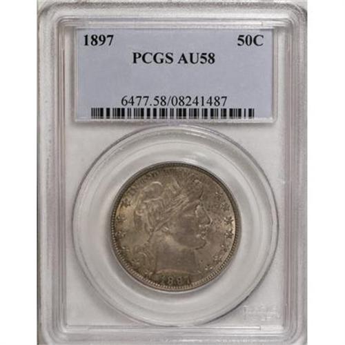 <B>1897 50C AU58 PCGS.</B></I> . PCGS Population (22/146). NGC Census: (18/116). Mintage: 2,480,731. Numismedia Wsl. Price for NGC/PCGS coin in AU58: $367. (#6477)<BR><BR><B>Coin Engraver:</B> Charles E. Barber<BR><BR><b>Shipping:</b> Coins & Currency (<a target="_blank" href="http://www.heritageauctions.com/common/shipping.php">view shipping information</a>)