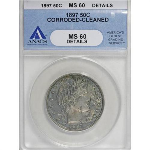 <B>1897 50C --Cleaned, Corroded--ANACS. MS60 Details.</B></I> NGC Census: (0/116). PCGS Population (1/145). Mintage: 2,480,731. Numismedia Wsl. Price for NGC/PCGS coin in MS60: $408. (#6477)<BR><BR><B>Coin Engraver:</B> Charles E. Barber<BR><BR><b>Shipping:</b> Coins & Currency (<a target="_blank" href="http://www.heritageauctions.com/common/shipping.php">view shipping information</a>)