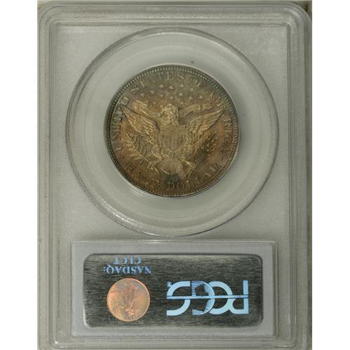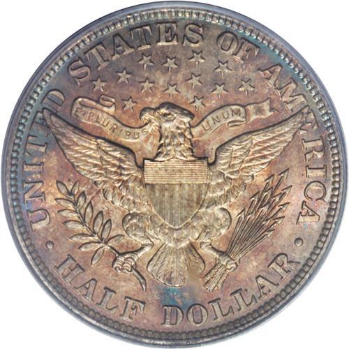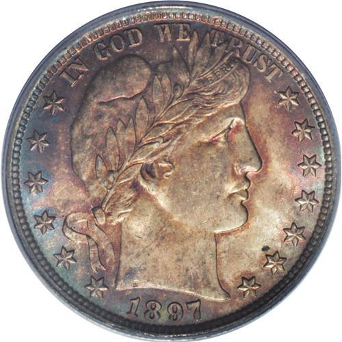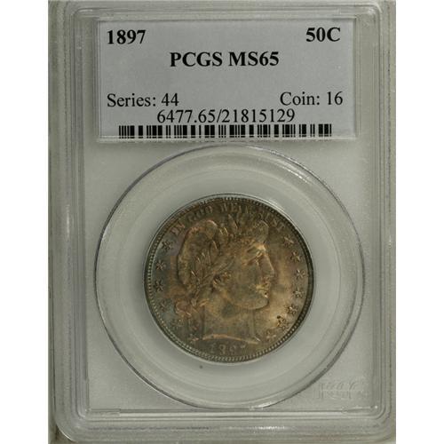 <B>1897 50C MS65 PCGS.</B></I> Richly toned and well defined throughout. A dollop of sunset-orange color dominates each side with an accent of blue at the borders. The satiny surfaces are smooth, and a couple of small die cracks are seen at the top of the reverse. A few wispy abrasions are noted on Liberty's cheek and neck, the only grade-limiting factors seen on this scarce Gem example. Population: 15 in 65, 22 finer (12/06).<BR><BR><b>Shipping:</b> Coin/Currency (<a target="_blank" href="http://www.heritageauctions.com/common/shipping.php">view shipping information</a>)