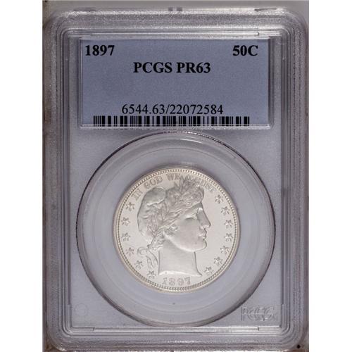 <B>1897<50C> PR63 PCGS.</B></I> Fully struck with mildly reflective fields and a faint coating of milky patina on both sides. A small contact mark is noted beneath Liberty's eye, but the delicate proof surfaces are otherwise contact-free. A few wispy hairlines are evident in the obverse fields.