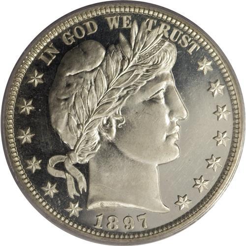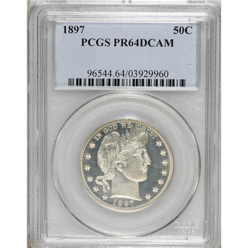 <B>1897 50C PR64 Deep Cameo PCGS.</B></I> Although some faint hairlines in the obverse fields prevent a higher grade, this is a wonderful example with impressive contrast between the fields and devices on each side. Both sides are sharply struck and fully brilliant with no evidence of toning.<BR><BR><b>Shipping:</b> Coins & Currency (<a target="_blank" href="http://www.heritageauctions.com/common/shipping.php">view shipping information</a>)