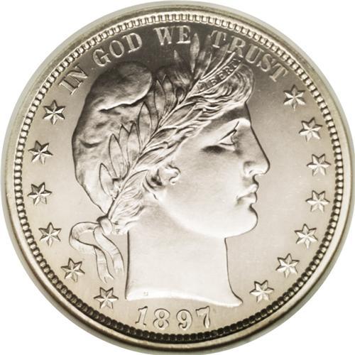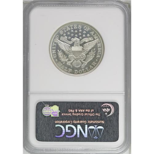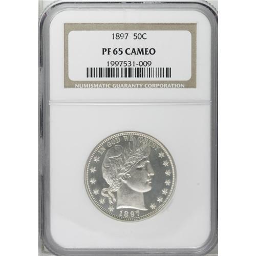 <B>1897<50C> PR65 Cameo NGC.</B></I> A median rarity among proof Barber halves. Only 731 proofs were struck, a mintage that stands in stark contrast to the 2.48 million business strikes of this date. This is a brilliant example that shows illimitable depth of reflectivity in the fields and a noticeable overlay of mint frost on the devices, the combination giving the coin a sharp cameo contrast. Crisp striking definition in all areas of this well-produced proof half. Census: 8 in 65, 24 finer (9/06).