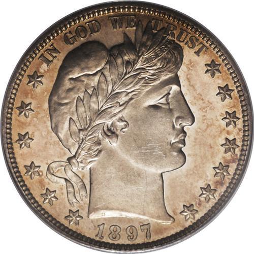 <B>1897 50C PR65 Cameo PCGS.</B></I> The golden-bronze patina that graces the fields of this Gem offers sharp contrast to the boldly struck and largely untoned devices, which have delightful frost. A handful of flaws are present on the obverse, but most of them are difficult to spot without magnification. Population: 8 in 65 Cameo, 8 finer (1/07).<BR><BR><b>Shipping:</b> Coins & Currency (<a target="_blank" href="http://www.heritageauctions.com/common/shipping.php">view shipping information</a>)