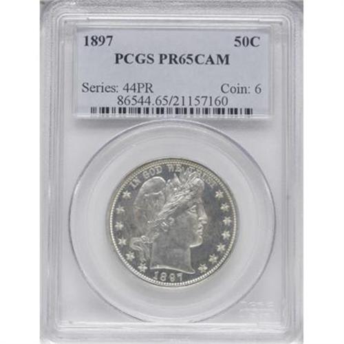<B>1897 50C PR65 Cameo PCGS.</B></I> Silver-white surfaces display dapples of light gray on portions of the obverse. The design features are well brought up, and their frosty finish yields strong contrast with the deeply mirrored fields. Close examination reveals no significant marks. Population: 8 in 65 Cameo 8 finer (11/07).<BR><I>From The Kallenberg #1 PCGS Registry Set Of Proof Half Dollars.</B></I><BR><BR><b>Shipping:</b> Coins & Currency (<a target="_blank" href="http://www.heritageauctions.com/common/shipping.php">view shipping information</a>)