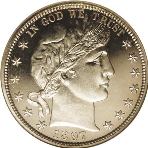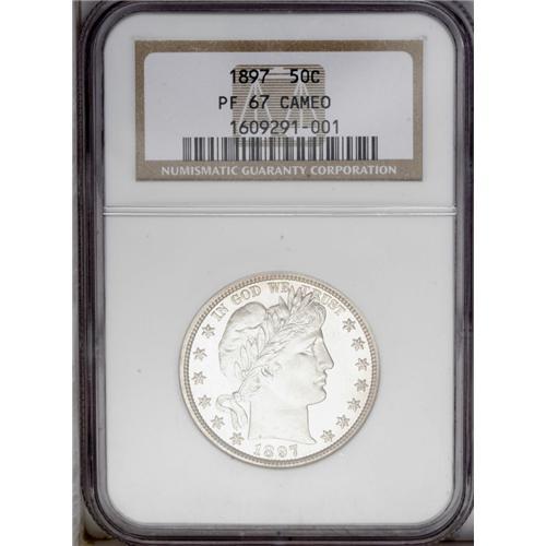 <B>1897<50C> PR67 Cameo NGC.</B></I> Although well known as a year when many proofs exhibit lavish cameo contrast, the level of preservation on this Superb representative combined with the dazzling eye appeal make it especially desirable. Untoned centers give way to hints of golden peripheral toning, only adding to the remarkable visual effect. Census: 9 in 67 Cameo, 7 finer (4/06).<BR><I>From The Rusty Forehand Collection.</B></I>