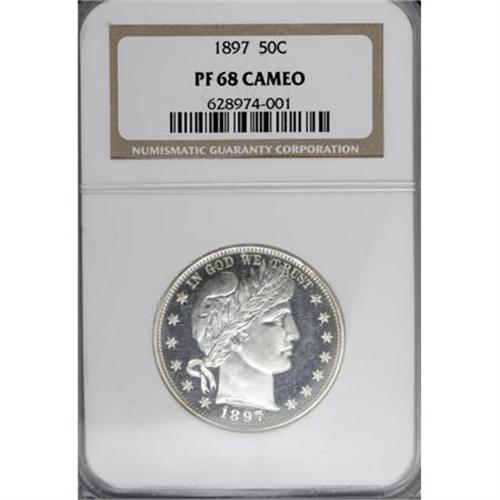 <B>1897 50C PR68 Cameo NGC.</B></I> A modest production of just 731 proof half dollars came off the coining press in 1897, and few have survived in the nearly pristine condition of this piece. Both sides have brilliant proof surfaces with only the slightest champagne toning confined to the borders. The contrast between the deeply mirrored fields and highly lustrous devices is exceptional. Details in the central design motifs are full and strong with every individual element in bold evidence. This is a remarkable Superb Gem proof that will capture the attention of the most advanced specialist or connoisseur.<BR><I>From The Nick-A-Jack Collection.</B></I><BR><BR><b>Shipping:</b> Coins & Currency (<a target="_blank" href="http://www.heritageauctions.com/common/shipping.php">view shipping information</a>)