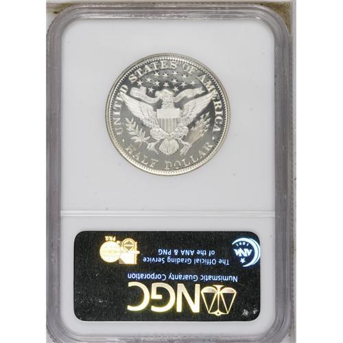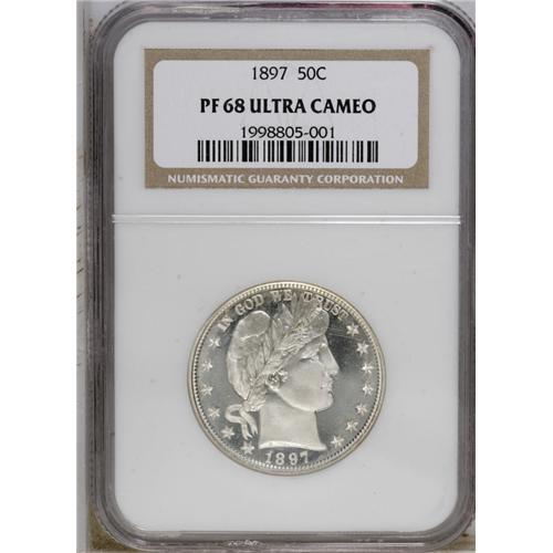 <B>1897 50C PR68 Ultra Cameo NGC.</B></I> The reverse provides spectacular contrast between the ice-white devices and the darkly mirrored field. The obverse contrast is nearly as remarkable, although the borders show light milky-gray toning. The strike is complete on the often-soft fletchings and claws, and even the right shield corner has pleasing definition. Pristine aside from a brief thin mark beneath obverse star 7, which will identify future appearances of this impressive proof Barber type coin. Only 731 proofs were struck. Census: 10 in 68 Ultra Cameo, 1 finer (10/06).<BR><BR><b>Shipping:</b> Coin/Currency (<a target="_blank" href="http://www.heritageauctions.com/common/shipping.php">view shipping information</a>)
