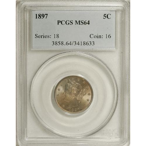 <B>1897 5C MS64 PCGS.</B></I> PCGS Population (161/70). NGC Census: (130/57). Mintage: 20,428,736. Numismedia Wsl. Price: $216. (#3858)<BR><BR><b>Shipping:</b> Coins & Currency (<a target="_blank" href="http://www.heritageauctions.com/common/shipping.php">view shipping information</a>)