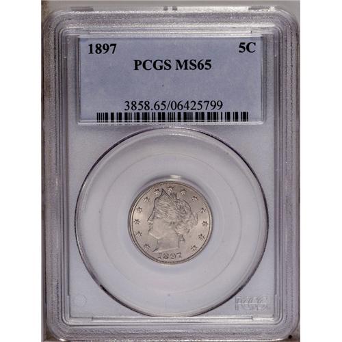 <B>1897<5C> MS65 PCGS.</B></I> Glowing luster emanates from golden-gray surfaces. The design elements are adequately struck, save for the bowknot and the wreath elements to its immediate left. A few faint slide marks on Liberty's cheek and neck are mentioned for accuracy. Population: 56 in 65, 8 finer (3/06). <BR><BR><B>Important notice:</B> Heritage usually auctions material at the rate of 200-250 lots per hour. On some occasions eBay Live bid software or the Internet may not be able to keep up with the pace of the auction. We recommend placing a realistic absentee bid now as insurance to avoid disappointment. Occasionally the auctioneer may eliminate or reject an eBay Live bid, and the auctioneer may also reopen a lot after the close of the eBay live bidding (usually because we missed an audience bid), and may reject your bid even if it shows you as the winning bidder. By bidding via eBay Live, you agree that Heritage may award the lot to another bidder at its sole discretion under the circumstances described above or any other reasonable circumstances. Since eBay bids are not shown to us until we open the lot on the floor, we treat those bids just like floor bids. In most cases the floor responds before the eBay bid is presented to us, due to Internet lag time, so for consistency we have made it a policy that floor bids are always considered first over tie eBay live bids. Also please note that all Heritage lots purchased through eBay Live carry a 20% Buyer's Premium. Please make sure you read the Terms and Conditions before you bid. This lot is being auctioned in conjunction with a live floor auction by Heritage Galleries & Auctioneers. All final auction and invoice information will be supplied by Heritage Galleries & Auctioneers, and all other information should be considered preliminary. Lot:934 <BR><BR><B>Winning Notification and Billing:</B> After the FINAL session in this auction is complete, Heritage will send e-mail and snail mail invoices. This process normally takes several days. All final auction and invoice information will be supplied by Heritage Galleries & Auctioneers, and all other information should be considered preliminary. <BR><BR>This auction will be conducted on a live auction floor and over the Internet through eBay Live. If you choose to place an absentee bid, please take a moment to <font color='#0000ff'><u><a href='http://pages.ebay.com/liveauctions/help/before/laabsentee.html'>learn how eBay Live absentee bidding works</a></u></font><font color='#000000'>