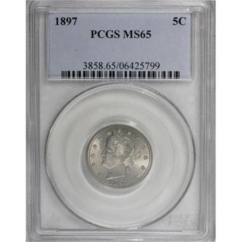 <B>1897 5C MS65 PCGS.</B></I> Vibrant luster emanates from light golden-gray surfaces. The design elements are boldly struck, save for the bowknot and left ear of corn. Population: 59 in 65, 11 finer (10/07).<BR><BR><B>Coin Engraver:</B> Charles E. Barber<BR><BR><b>Shipping:</b> Coins & Currency (<a target="_blank" href="http://www.heritageauctions.com/common/shipping.php">view shipping information</a>)