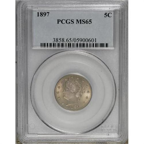 <B>1897 5C MS65 PCGS.</B></I> Dusky caramel-gold toning enriches this lustrous and exquisitely preserved Gem. A good strike with only unimportant softness on the left ear of corn. Population: 59 in 65, 11 finer (1/08).<BR><BR><B>Coin Engraver:</B> Charles E. Barber<BR><BR><b>Shipping:</b> Coins & Currency (<a target="_blank" href="http://www.heritageauctions.com/common/shipping.php">view shipping information</a>)