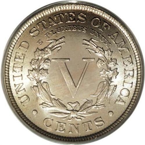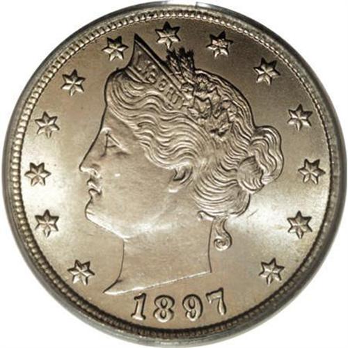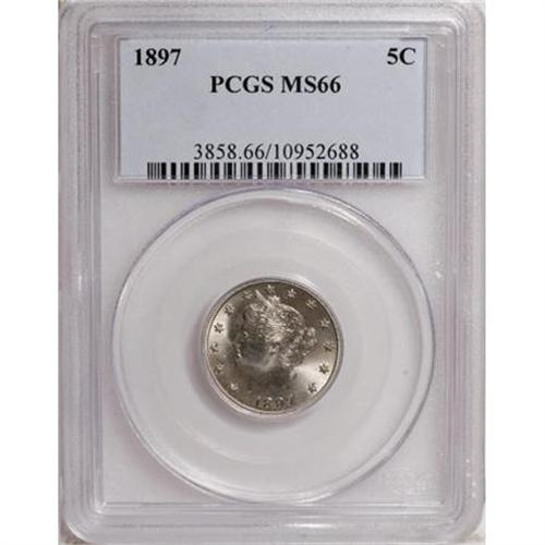 <B>1897 5C MS66 PCGS.</B></I> Light autumn-brown streaks overlie the lustrous and unblemished surfaces. Boldly impressed despite minor characteristic incompleteness on the left ear of corn. A minor mint-made strike-through is seen near the C in CENTS. A lovely example of this conditionally challenging date. Population: 10 in 66, 1 finer (6/07).<BR><BR><B>Coin Engraver:</B> Charles E. Barber<BR><BR><b>Shipping:</b> Coins & Currency (<a target="_blank" href="http://www.heritageauctions.com/common/shipping.php">view shipping information</a>\)