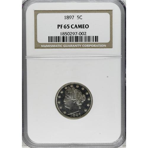<B>1897 5C PR65 Cameo NGC.</B></I> Nearly all Liberty nickels are elusive with cameo contrast, and few have been described as Cameo proofs by NGC. This brilliant gray piece is one such coin with deeply mirrored fields that are accented by faint traces of gold toning. It is sharply struck and has exceptional contrast with fully lustrous devices. Census: 18 in 65 Cameo, 25 finer (4/07).<BR><BR><b>Shipping:</b> Coins & Currency (<a target="_blank" href="http://www.heritageauctions.com/common/shipping.php">view shipping information</a>)