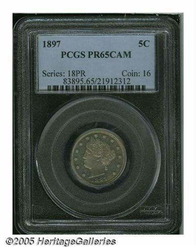 <B>1897<5C> PR65 Cameo PCGS.</B></I> Fully struck with blemish-free surfaces and faint milky toning in the fields, on both sides. Mild cameo contrast is noted, making this a conditionally scarce premium Gem proof.