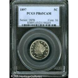<B>1897 5C PR65 Cameo PCGS.</B></I> The only toning on this otherwise brilliant specimen is a splash of gold on the upper left wreath. The frosted devices stand out clearly against the mirrored fields, and while the piece is nicely struck overall, there is some softness in the corn and leaves left of the bow knot. Population: 11 in PR65 Cameo, 29 finer (1/05). Lot:5931