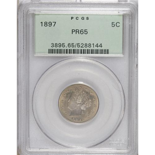 <B>1897 5C PR65 PCGS.</B></I> Apricot, lime, and olive embrace this flashy and needle-sharp Gem. An aesthetic prize for the toning enthusiast. Encapsulated in a green label holder.<BR><BR><b>Shipping:</b> Coins & Currency (<a target="_blank" href="http://www.heritageauctions.com/common/shipping.php">view shipping information</a>)