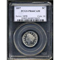 <TABLE cellSpacing=0 cellPadding=0 width="100%" bgColor=#000000 border=0><TBODY><TR><TD width="100%"><TABLE cellSpacing=1 cellPadding=3 width="100%" border=0><TBODY><TR><TD width="100%" bgColor=#79735c><FONT face=arial color=#ffffff size=3><B>Description</B> </FONT></TD></TR><TR><TD width="100%" bgColor=#ffffff><FONT face=arial size=2><B>1897 5C PR66 Cameo PCGS.</B></I> Deeply reflective in the fields, the devices are fully frosted with razor-sharp definition throughout. Both sides are near-brilliant, with light milky haze in the fields, and eye appeal to spare. Population: 4 in 66, 1 finer (8/03). </FONT></TD></TR></TBODY></TABLE></TD></TR></TBODY></TABLE><BR><A name=PricesRealized></A><TABLE cellSpacing=0 cellPadding=0 width="100%" bgColor=#000000 border=0><TBODY><TR><TD width="100%"><TABLE cellSpacing=1 cellPadding=3 width="100%" border=0><TBODY><TR><TD width="100%" bgColor=#79735c><A name=PR><FONT face=arial color=#ffffff size=3><B>Previous Prices from Heritage Auctions</B> </FONT></A></TD></TR><TR><TD bgColor=#f6f6ed><TABLE cellSpacing=0 cellPadding=0 width="100%" border=1><TBODY><TR><TD align=middle width="33%"><B>Date</B></TD><TD align=middle width="33%"><B>Service</B></TD><TD align=middle width="33%"><B>Price</B></TD></TR><TR bgColor=whitesmoke><TD width="33%"><B>11/23/2002</B></TD><TD width="33%">PCGS</TD><TD width="33%">$977.50</TD></TR><TR bgColor=whitesmoke><TD width="33%"><B>09/28/2002</B></TD><TD width="33%">PCGS</TD><TD width="33%">$1,035.00</TD></TR><TR bgColor=whitesmoke><TD width="33%"><B>07/02/2002</B></TD><TD width="33%">PCGS</TD><TD width="33%">$1,006.25</TD></TR><TR bgColor=whitesmoke><TD width="33%"><B>05/03/2003</B></TD><TD width="33%">PCGS</TD><TD width="33%">$1,035.00</TD></TR><TR bgColor=whitesmoke><TD width="33%"><B>04/15/2003</B></TD><TD width="33%">NGC</TD><TD width="33%">$632.50</TD></TR><TR bgColor=whitesmoke><TD width="33%"><B>01/11/2003</B></TD><TD width="33%">NGC</TD><TD width="33%">$661.25</TD></TR><TR bgColor=whitesmoke><TD width="33%"><B>08/05/2000</B></TD><TD width="33%">NGC</TD><TD width="33%">$718.75</TD></TR></TBODY></TABLE></TD></TR><TR><TD bgColor=#ffffff><FONT face=arial size=1 ?>PLEASE NOTE: All prices realized reflect the final hammer price PLUS the buyer's premium in auctions that charge a buyer's premium. Each item has a notation at the top of the listing indicating whether that lot included a buyer's premium. Example: A item that sells with a final hammer price of $100 and a 20% buyer's premium will display with a price realized of $120. All information listed is intended to be as accurate as possible, but errors are possible. Please use this guide carefully and inform us of any inaccuracies. </FONT></TD></TR></TBODY></TABLE></TD></TR></TBODY></TABLE><BR><TABLE cellSpacing=0 cellPadding=0 width="100%" bgColor=#000000 border=0><TBODY><TR><TD width="100%"><TABLE cellSpacing=1 cellPadding=3 width="100%" border=0><TBODY><TR><TD width="100%" bgColor=#79735c colSpan=6><FONT face=arial color=#ffffff size=3><B>Price Guide*</B> </FONT></TD></TR><TR bgColor=#f6f6ed><TD align=middle><B>Grade</B> </TD><TD align=middle><B>Coin World<BR>(Trends)</B> </TD><TD align=middle><B>Numismedia<BR>Retail</B> </TD><TD align=middle><B>Numismedia<BR>Wholesale</B> </TD><TD align=middle><B>Coin<BR>Universe</B> </TD><TD align=middle><B>Heritage<BR>Value Index</B> </TD></TR><TR bgColor=#ffffff><TD align=middle>65</TD><TD align=right>---</TD><TD align=right>---</TD><TD align=right>---</TD><TD align=right>---</TD><TD align=right>$458.00</TD></TR><TR style="FONT-WEIGHT: bold" bgColor=#cccfdd><TD align=middle>66</TD><TD align=right>---</TD><TD align=right>---</TD><TD align=right>---</TD><TD align=right>---</TD><TD align=right>---</TD></TR><TR bgColor=#ffffff><TD align=middle>67</TD><TD align=right>---</TD><TD align=right>---</TD><TD align=right>---</TD><TD align=right>---</TD><TD align=right>---</TD></TR><TR bgColor=#ffffff><TD colSpan=6><FONT size=1>*All information listed is intended to be as accurate as possible, but errors are possible. No item may be returned or refused based on this information which is provided as a service to our customers. You should contact each pricing source directly to determine the accuracy of this information. </FONT></TD></TR></TBODY></TABLE></TD></TR></TBODY></TABLE><BR><TABLE cellSpacing=0 cellPadding=0 width="100%" bgColor=#000000 border=0><TBODY><TR><TD width="100%"><TABLE cellSpacing=1 cellPadding=3 width="100%" border=0><TBODY><TR><TD width="100%" bgColor=#79735c><FONT face=arial color=#ffffff size=3><B>Population Guide</B> </FONT></TD></TR><TR bgColor=#ffffff><TD align=middle><!-- Begin Output of Population Grid--><TABLE cellSpacing=0 cellPadding=0 width="100%" border=0><TBODY><TR><TD vAlign=center><TABLE cellSpacing=0 width="100%" border=1 cellsadding="3"><TBODY><TR><TD vAlign=center><TABLE cellSpacing=0 cellPadding=3 width="100%" border=1><TBODY><TR><TD vAlign=center align=middle bgColor=#f0f1e8 colSpan=2 <CENTER><FONT face=Arial size=2><B>PCGS Pop </B></FONT><CENTER></CENTER></TD><TD vAlign=center align=middle bgColor=#f0f1e8 colSpan=2><CENTER><FONT face=Arial size=2><B>NGC Pop</B></CENTER></FONT></TD></TR><TR><TD vAlign=center><FONT face=Arial size=2>(66)</FONT> </TD><TD vAlign=center align=right><FONT face=Arial size=2>4</FONT> </TD><TD vAlign=center><FONT face=Arial size=2>(66)</FONT> </TD><TD vAlign=center align=right><FONT face=Arial size=2>12</FONT> </TD></TR><TR><TD vAlign=center><FONT face=Arial size=2>(>66)</FONT> </TD><TD vAlign=center align=right><FONT face=Arial size=2>1</FONT> </TD><TD vAlign=center><FONT face=Arial size=2>(>66)</FONT> </TD><TD vAlign=center align=right><FONT face=Arial size=2>3</FONT> </TD></TR></TBODY></TABLE></TD></TR></TBODY></TABLE></TD></TR></TBODY></TABLE><!-- End Output of Population Grid--> Important notice: Heritage usually auctions material at the rate of 200-250 lots per hour. On some occasions eBay Live bid software or the Internet may not be able to keep up with the pace of the auction. 
