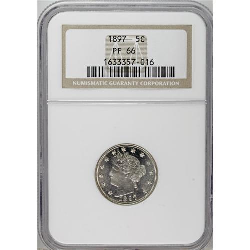 <B>1897 5C PR66 NGC.</B></I> A well-preserved and highly reflective survivor from the original mintage of 1,938 pieces. Liberty's features are crisp. Census: 53 in 66, 25 finer (10/06).<BR><BR><b>Shipping:</b> Coin/Currency (<a target="_blank" href="http://www.heritageauctions.com/common/shipping.php">view shipping information</a>)