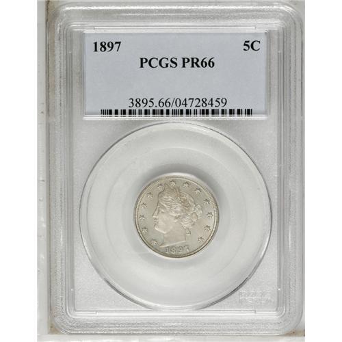 <B>1897<5C> PR66 PCGS.</B></I> A moderately reflective Premium Gem with thick gold and violet patina over both sides. The devices have the usual sharp detail. Population: 58 in 66, 21 finer (7/06).