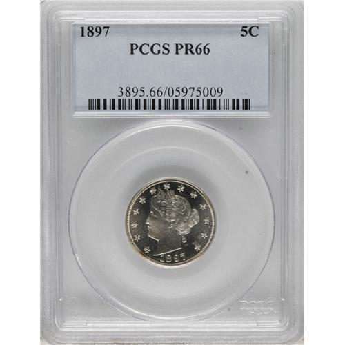 <B>1897 5C PR66 PCGS.</B></I> Fully struck with complete star centrils and ears of corn. The piece has an amazingly bright, highly reflective appearance. Mostly brilliant and exceptionally preserved. Population: 58 in 66, 21 finer (2/07).<BR><BR><b>Shipping:</b> Coins & Currency (<a target="_blank" href="http://www.heritageauctions.com/common/shipping.php">view shipping information</a>)